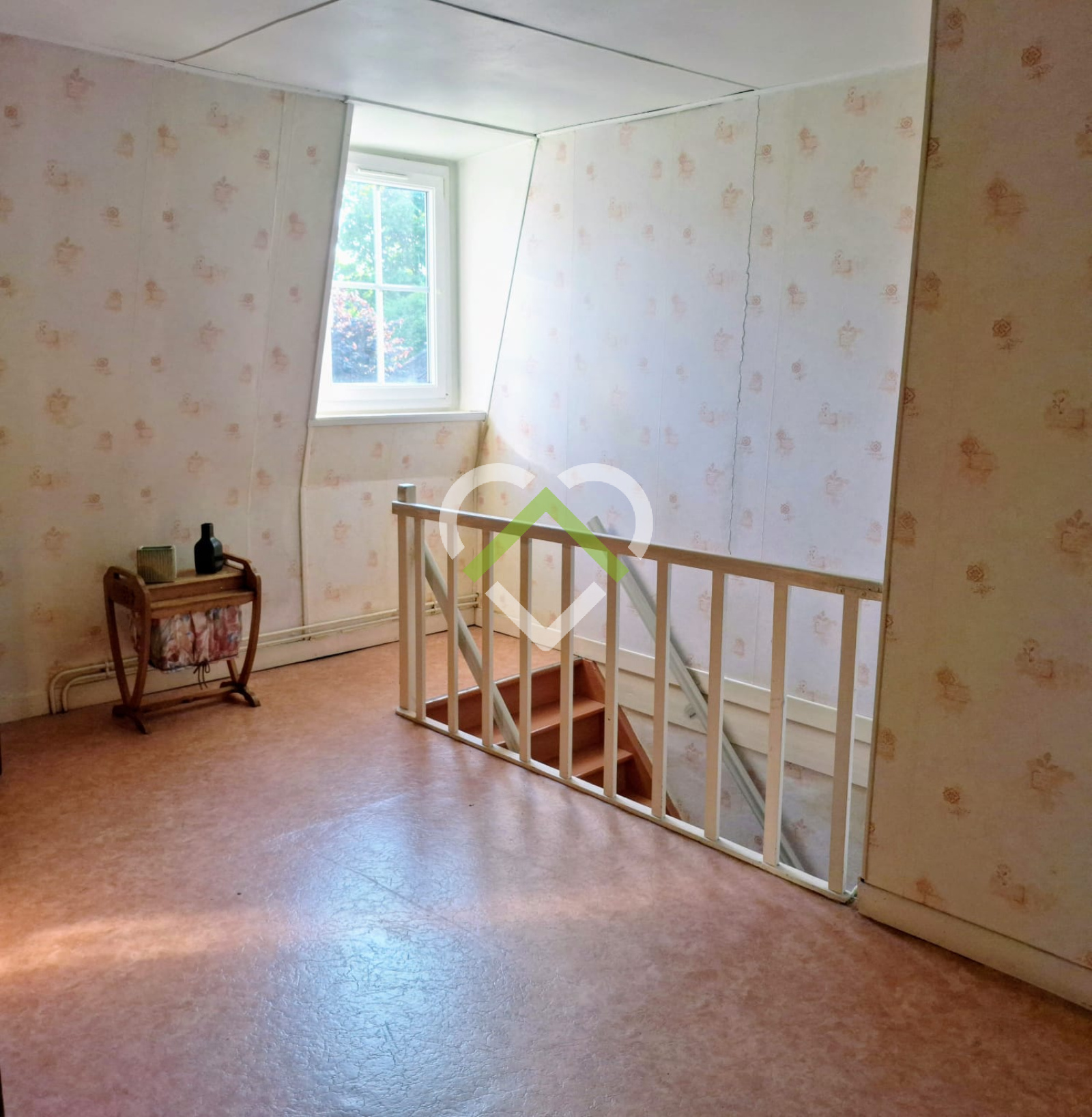 A l'étage : grand palier donnant sur 3 chambres, salle de bains, WC séparés + un grenier aménageable.
