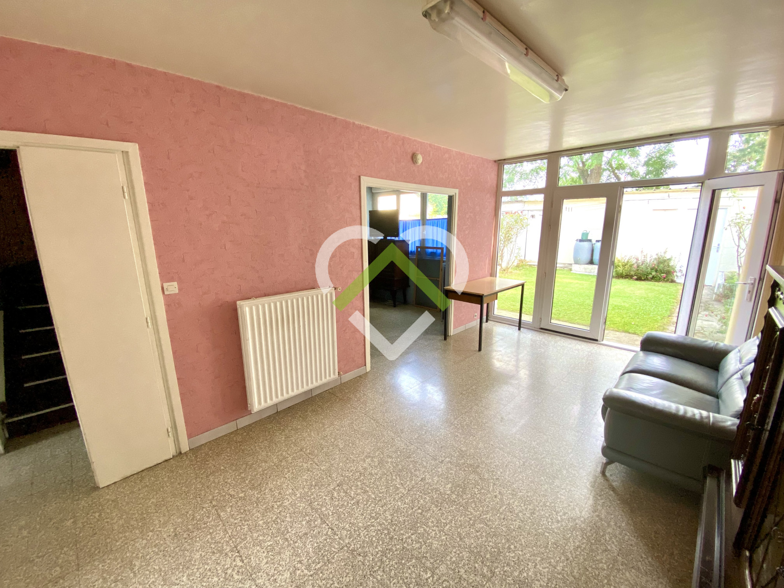 Elle se compose d'un vaste hall d'entrée avec nombreux rangements, salon / séjour en L de 30m² donnant sur jardin, cuisine meublée.