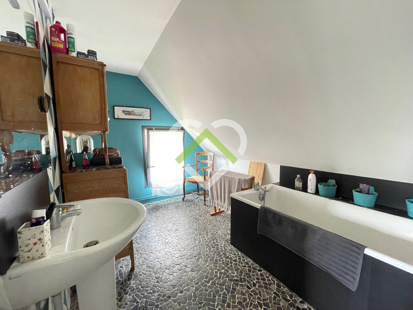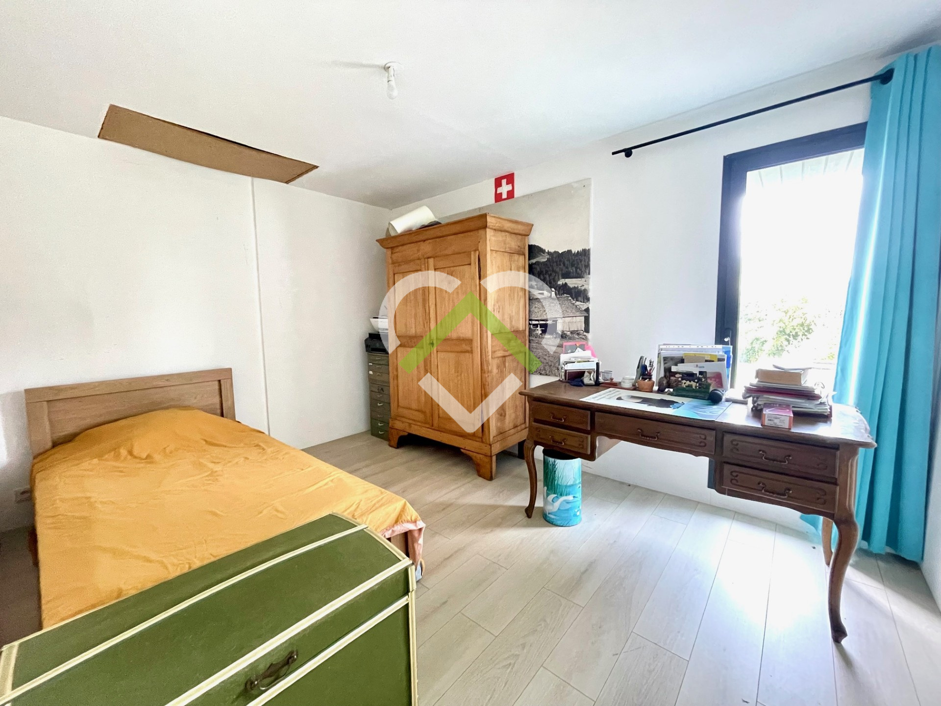 A l'étage un palier vous conduit dans une grande chambre de 17m2, une salle de bains & deux autres chambres.